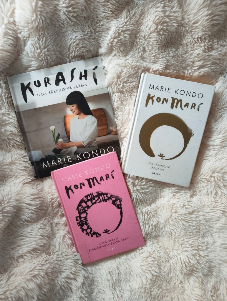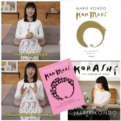 Niinhän sitä taas kerran reippahasti kävivät askeleet ja äiti meni vallan mutkalle kilometrisen työlistansa ja metatyölistansa painojen alla. Tonttukollegat kurkkivat ikkunoista, ja suu messingillä piti taklata marraskuisen muuton jälkeistä muuttokaaosta ja siinä samalla pyöritettävä suurperhearkea jouluvalmistelujen ohessa. Että tip ja tap vaan itse kullekin säädylle. Onneksi self-help-kirjallisuus on kovasti suosittua, eikä nenä self-helpin uumenissa näe ympärillä vallitsevaa kaaosta. Olen aktiivisesti vältellyt KonMari-juttuja viimeisen vuosikymmenen, päätin muuttopakkauksen yhteydessä vihdoin vilkaista, onko siinä mitään järkeä. Pari muutakin saman aihepiirin kirjaa saatoin ohimennen ahmaista, ja siitäpä syntyi tämä teksti.