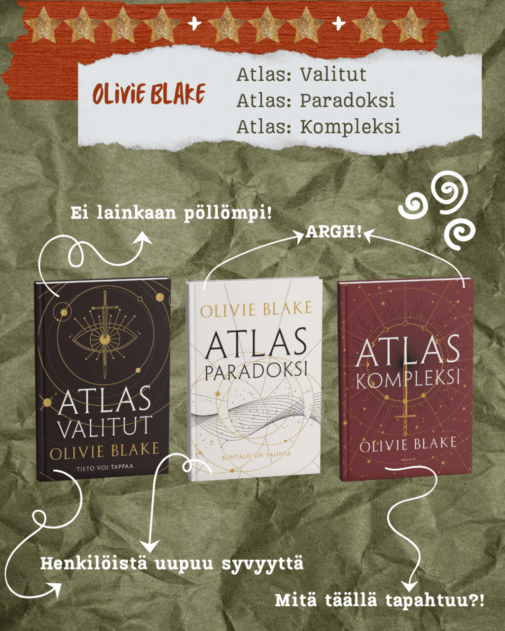 Kerran vuosikymmenessä ikäluokkansa lahjakkaimmat maagikot pääsevät kilvoittelemaan Aleksandria-seuran jäsenyydestä, siis käytännössä pääsystä rajattoman tiedon ääreen. Mainetta ja valtaa lupaillaan, mikäli arpa osuu omalle kohdalle, mutta samalla varoitellaan tiedon tuovan tuskaa tai voivan jopa tappaa. Tästä varsin houkuttelevasta lähtökohdasta lähtee Olivie Blaken trilogia: Atlas: Valitut (Aula & co 2023, suomentanut Sarianna Silvonen), Atlas: Paradoksi (Aula & co 2024, suomentanut Kaisa Ranta) ja Atlas: Kompleksi (Aula & co 2025, suomentanut Kaisa Ranta). Olen vuosien varrella bongaillut kirjoja kirjasomesta säännöllisesti, ja kun ensimmäinen osa sattui osumaan silmääni elämäni valossa eli E-kirjasto-sovelluksessa, en keksinyt ainuttakaan syytä olla lukematta sitä, onhan akateemisiin ympyröihin sijoittuva spekulatiivinen fiktio on sydäntäni lähellä.